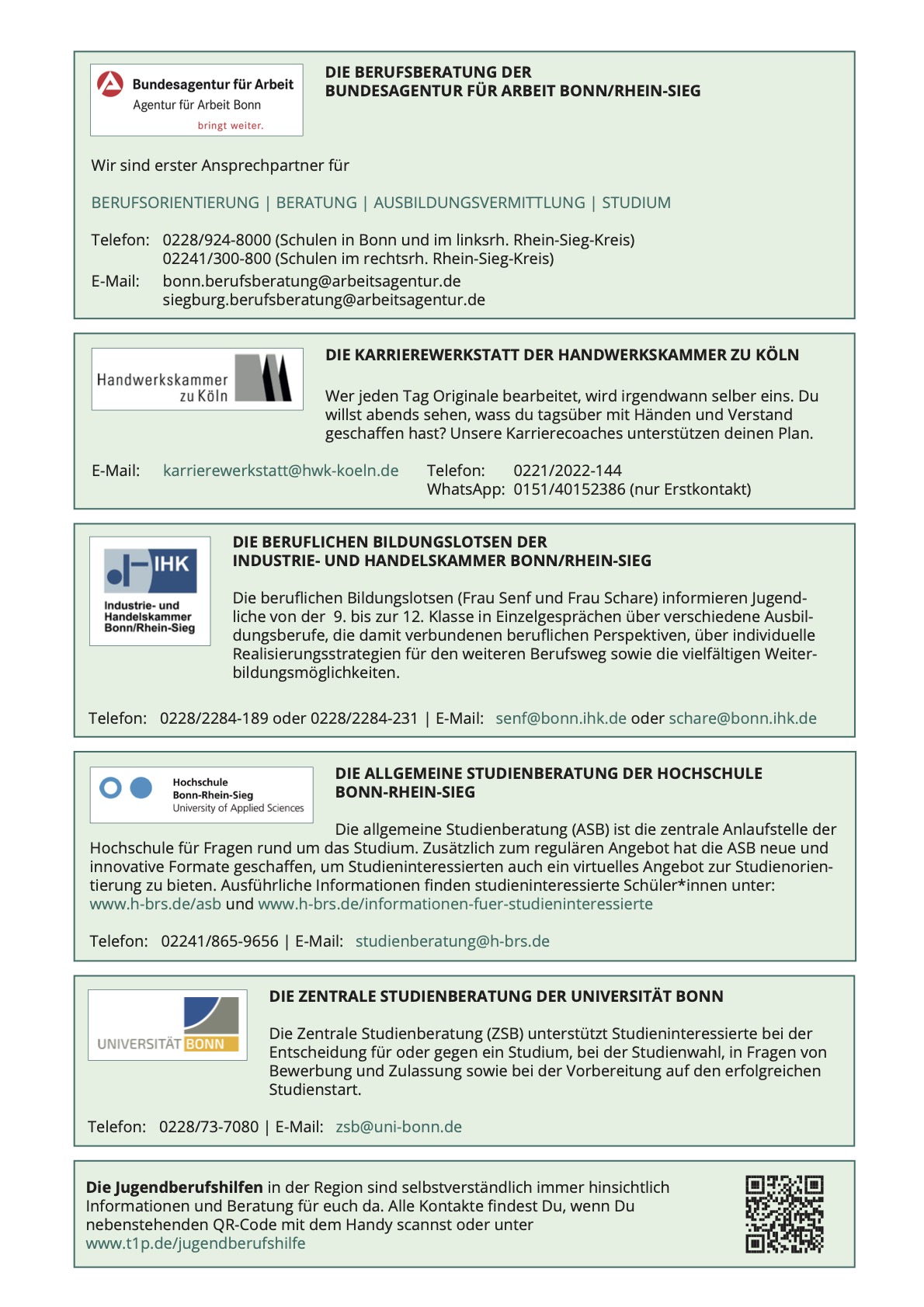 Dabei arbeiten wir im Übergang Schule - Beruf eng zusammen mit Partnern aus den Kliniken, der Schulsozialarbeit der Stadt Bonn, der Reha-Beratung der Arbeitsagentur und verschiedenen Berufskammern.